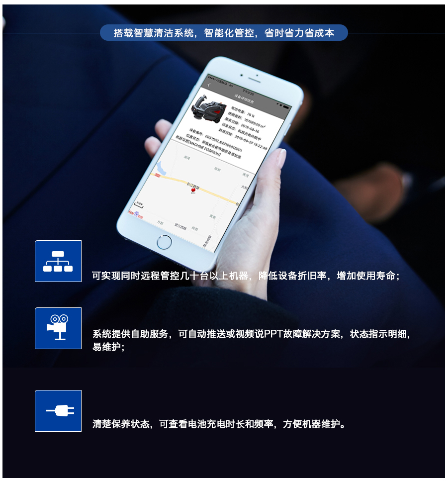 S-1900ED集成前卫的设计理念,智能的操作系统,以及优秀的清扫效果,是国产智能扫地机的佳作。封闭是的汽车驾驶室,舒适安全,适合在雨水,寒冷,恶尘的环境下使用。