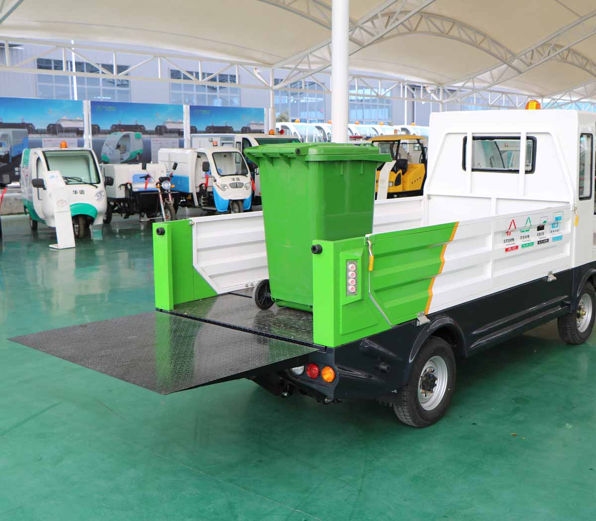 2、车辆尾部采用液压升降尾板装置,只要一人操作即可完成垃圾桶或其他干式货物的装卸