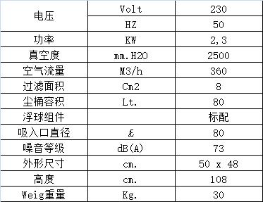 吸水系统装有浮球装置,能够防止液体、泡沫和固体物进入电机;装有尼龙过滤网其作用是防止固体物堵塞浮球和泡沫进入电机。 尘桶容量80 lt. ,装有排水管,排水很方便。钢制机身经过环氧漆表面处理,底部装有4个车轮,包括2个转向轮,其中1个带刹车。